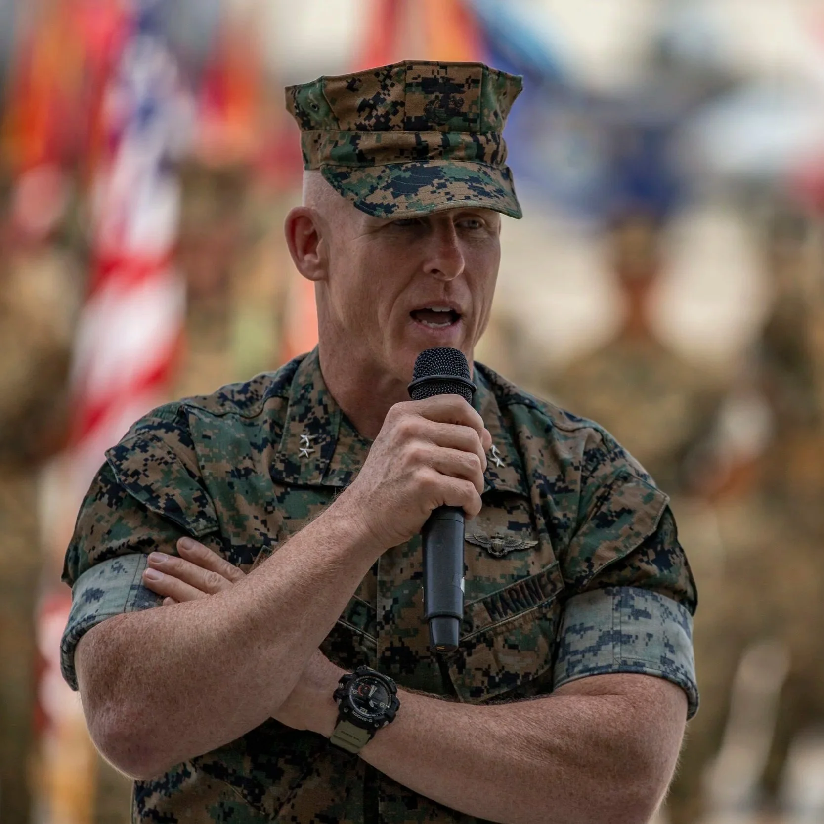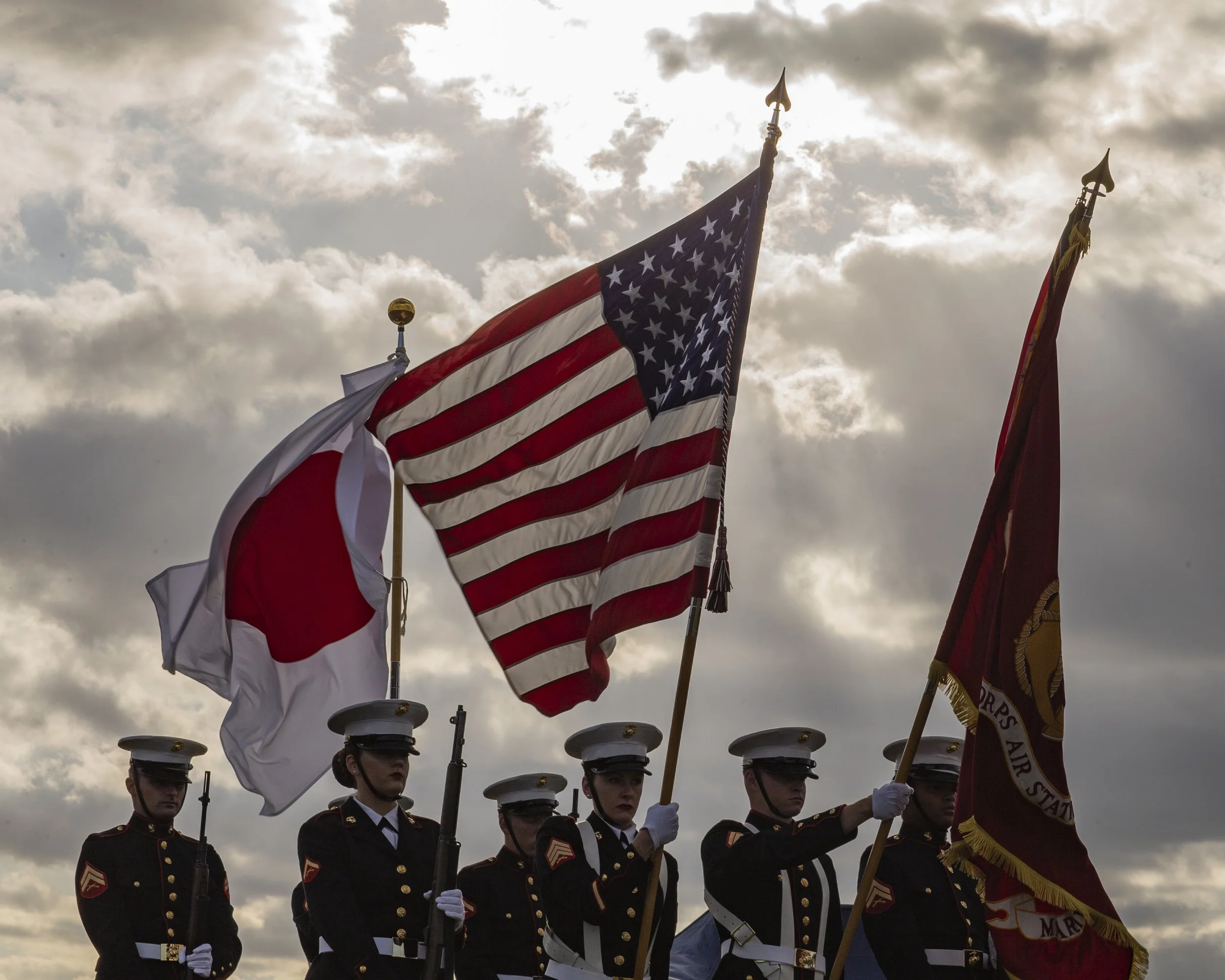 In this photo, U.S. Marines conduct a ceremony for the Marine Corps Birthday on Marine Corps Air Station Iwakuni, Japan. Though the ceremony holds no particular significance for Japan (except perhaps the Marine Corps’ involvement in the Pacific Campaign in WWII), the Japanese flag is flown alongside the American and Marine Corps Flags, a symbol of Japanese power.